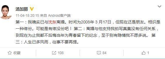 對於分開主因,湯加麗澄清說:「和拍寫真集沒有任何關係,到現在為止,我都不後悔當年為青春留下的紀念。人生已多風雨,往事不要再提。」也感慨彼此相識是緣分,沒能走下去,可能是有緣沒份吧。