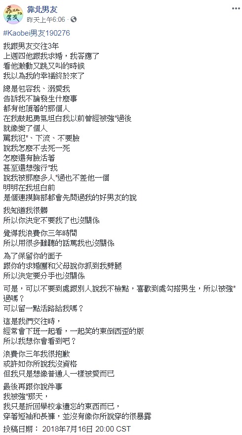 為了要讓男方看到這則貼文,她也特地在以前兩人愛看的「靠北男友」粉專上留下這則發文,並隔空對男方喊話:「浪費你三年我很抱歉,或許如你所說我沒資格,但我只是想像普通人一樣被愛而已。」而且被侵.犯的那天,自己只是回學校拿個東西,全身穿長袖長褲根本就沒有勾引任何人...