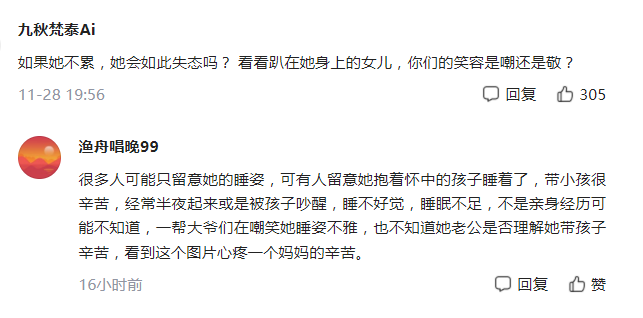 也有感同身受的媽媽們留言表示,「很多人可能只留意她的睡姿,可有人留意她抱著懷中的孩子睡著了,帶小孩很辛苦,經常半夜起來或是被孩子吵醒,睡不好覺,睡眠不足,不是親身經歷可能不知道,一幫大爺們在嘲笑她睡姿不雅,也不知道她老公是否理解她帶孩子辛苦,看到這個圖片心疼一個媽媽的辛苦。」
