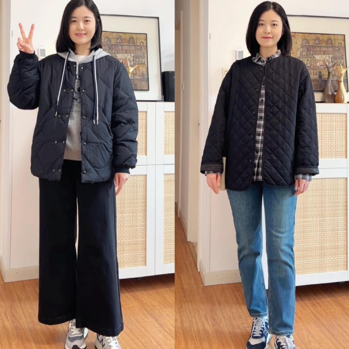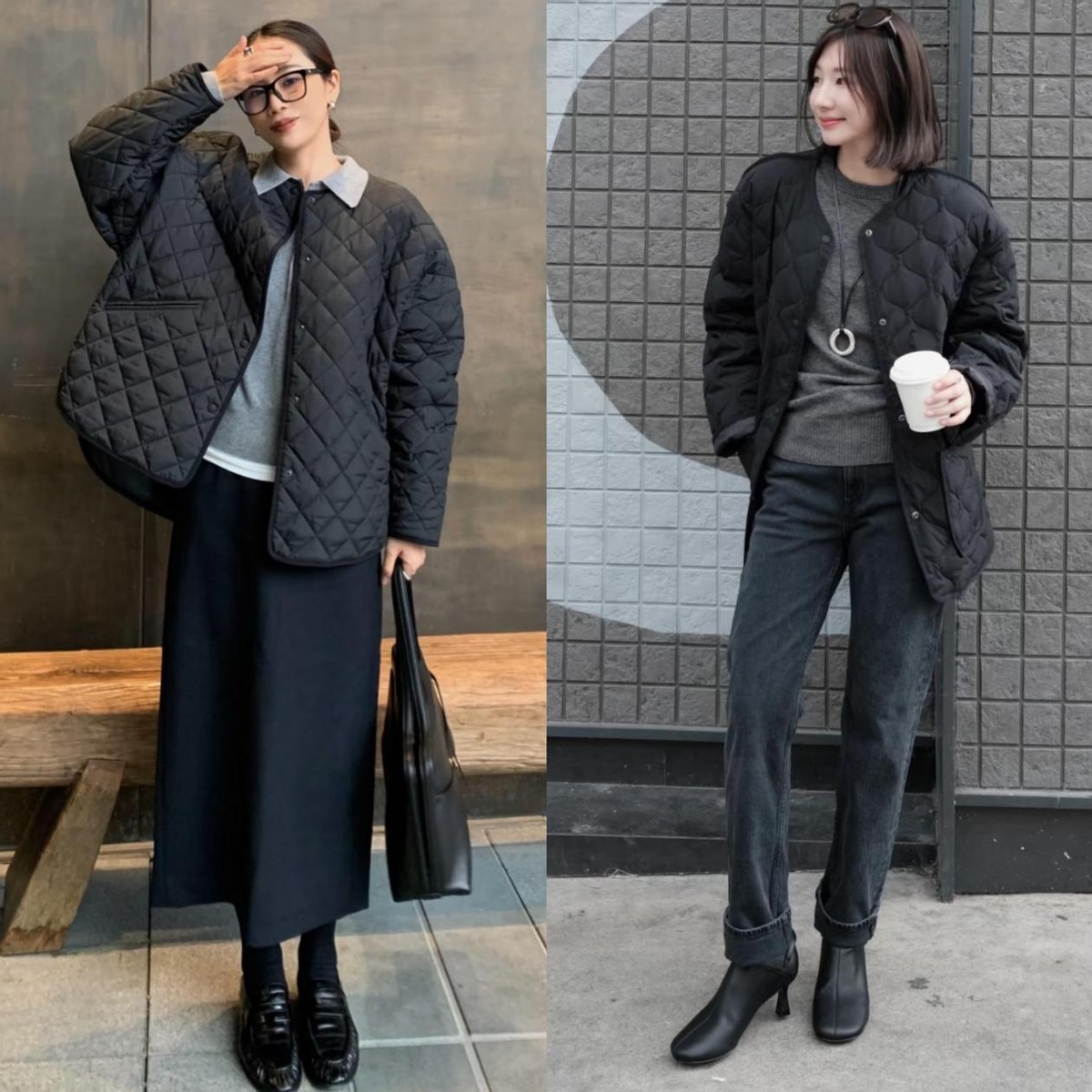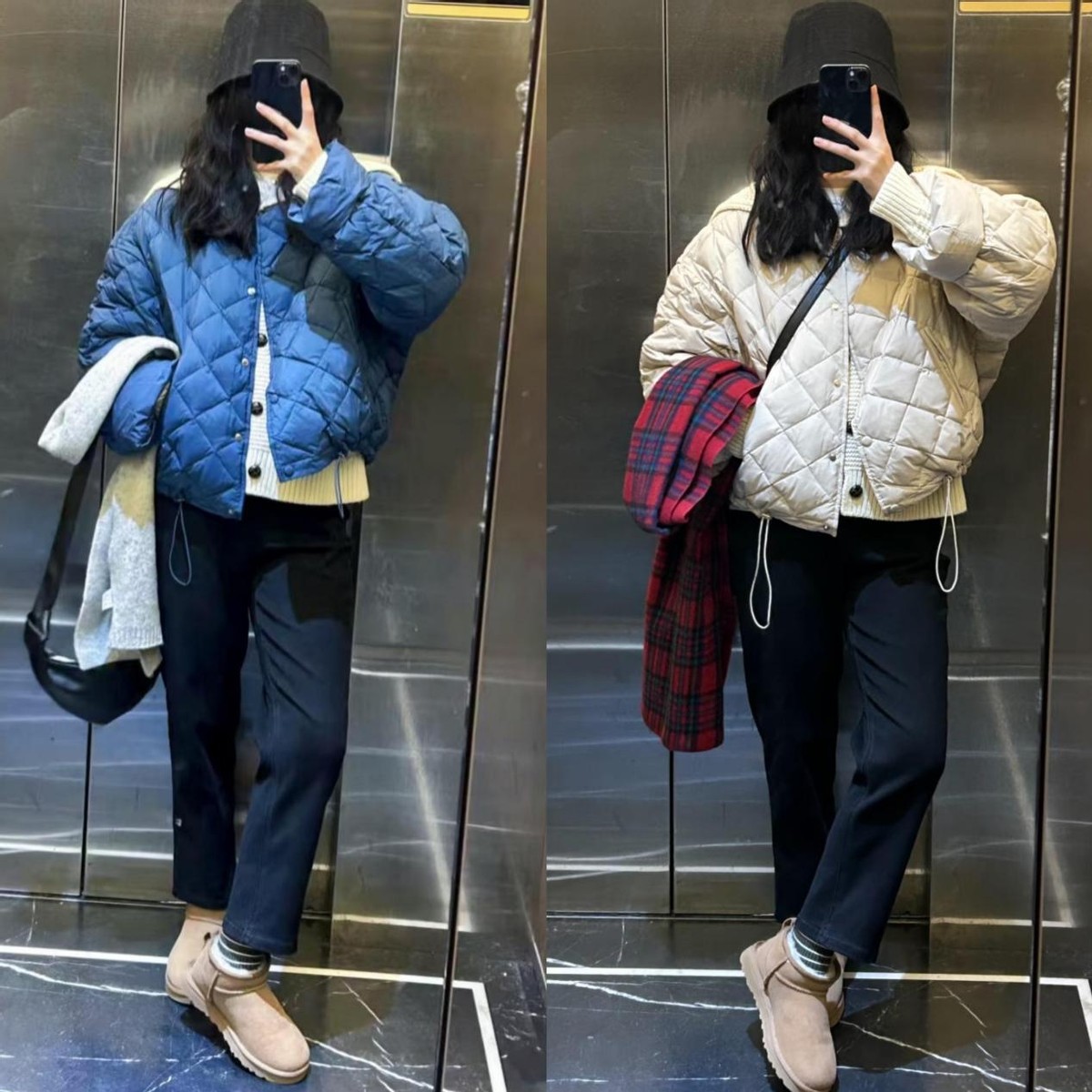 直接選擇深色的奶奶棉服也沒有問題,不過我建議挑選黑色、藏青色這些顏色更深的顏色,不選大地色系,足夠深的顏色才有收縮瞳孔的作用,才能顯瘦,關鍵是絎縫配上深色,有一種高智感,很高級。