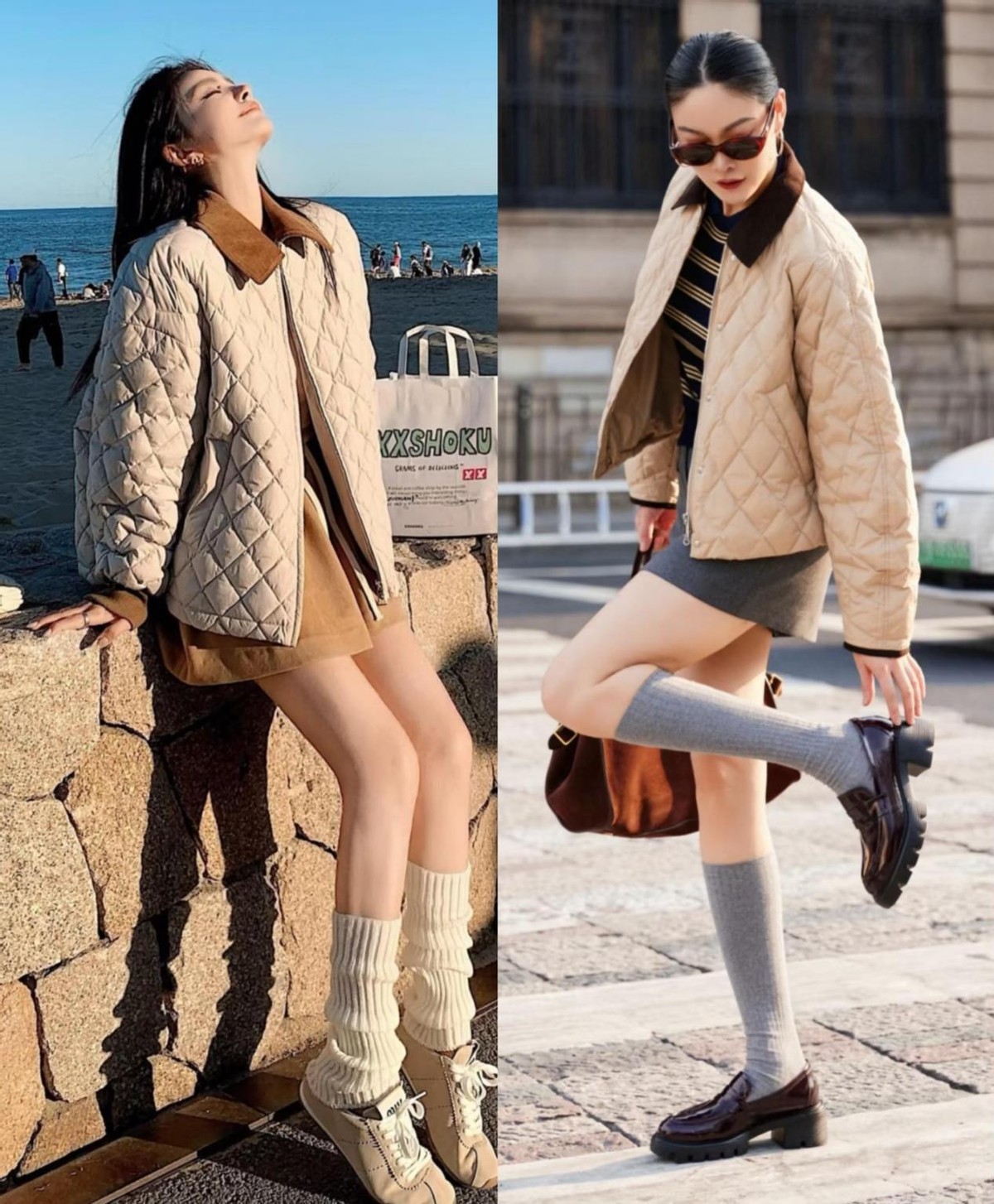 追求個性打扮的女生,用奶奶棉服搭配短褲,棉服的長度蓋過短褲,營造出下半身失蹤的錯覺,再配上一雙長靴,這樣的造型無疑更有特點,個性十足,摩登時髦。